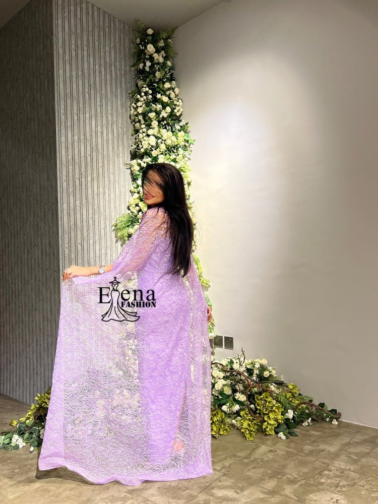 فستان لافندر هو عنوان الأنوثة والرقي، بلونه الموف الفاتح الذي يعكس النعومة والجاذبية. مصنوع من قماش الكريب الفاخر مع صدر شفاف من التول المزين بالترتر البراق ليمنحكِ لمسة فاخرة ومميزة. تصميمه الانسيابي يجعله مثاليًا للسهرات والمناسبات الراقية، حيث يضفي عليكِ حضورًا أنيقًا لا يُقاوم.