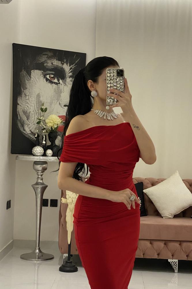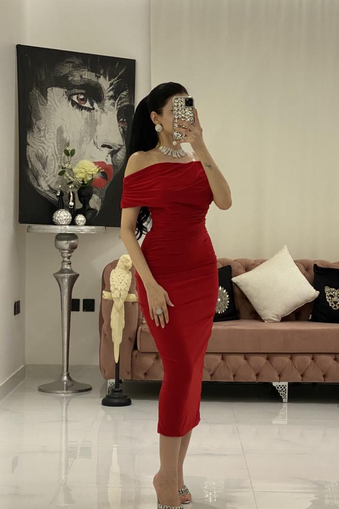 فستان أنيق باللون الأحمر الجذاب، مصمم بقصة أوف شولدر مع كشكشة ناعمة تمنحك إطلالة ساحرة وأنثوية. مصنوع من قماش فاخر ينساب برقي على الجسم، ليبرز جمالك بثقة وأناقة في كل مناسبة