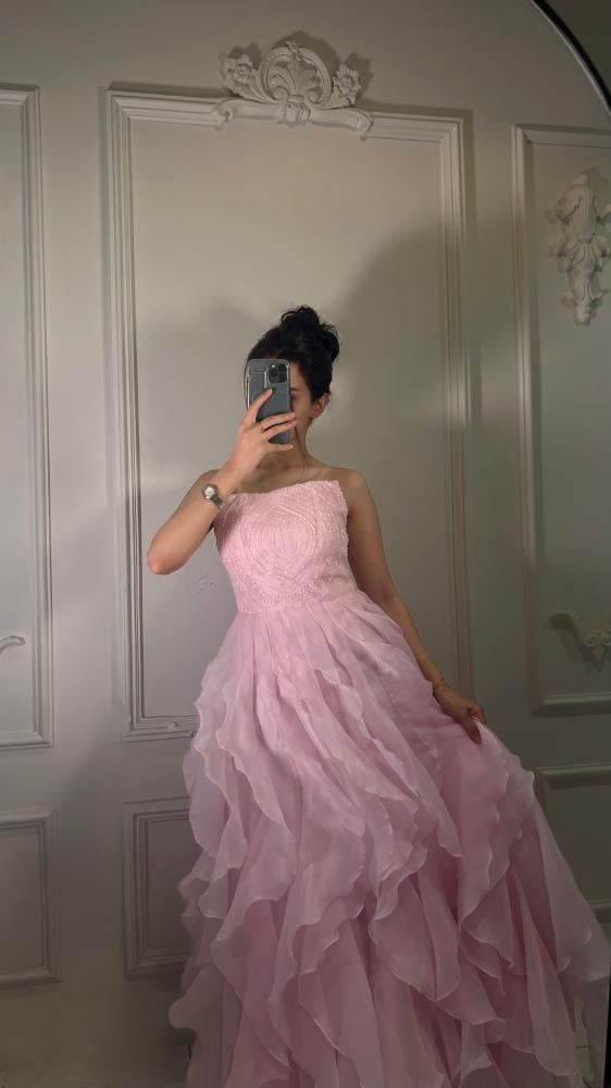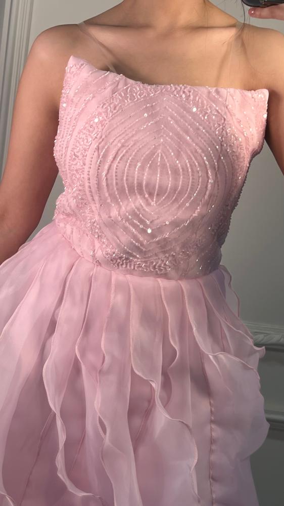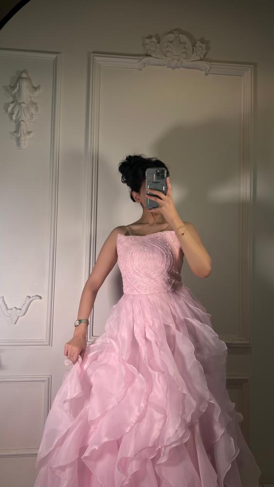 فستان “وردية الغيم” هو تجسيد ناعم للرقة الحالمة، مصمم بلون وردي باستيلي ساحر ينبض بأنوثة خالدة. يتميز الصدر بقصة مشدودة ومطرزة بدقة باستخدام خرزات لامعة مرصوصة بتناسق دائري يعطي بعداً بصرياً ناعماً. أما التنورة، فهي تنساب بطبقات من الشيفون الخفيف المتدرج بشكل يشبه الأمواج أو بتلات الزهور، ما يمنح الفستان حجماً ملكياً مميزاً دون أن يفقد خفة حركته. تصميمه بدون أكمام يُبرز الأكتاف والرقبة برقي، ليكون الخيار المثالي لحفلات الخطوبة، أو المناسبات الفاخرة التي تتطلب إطلالة تشبه الحلم