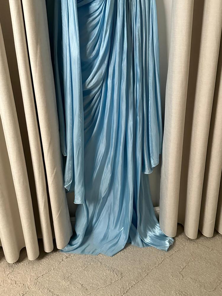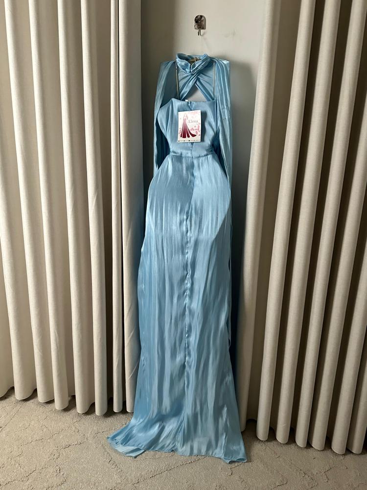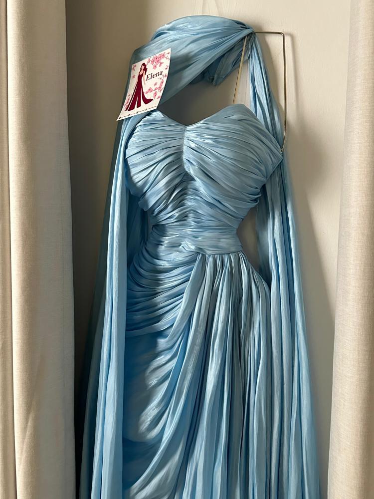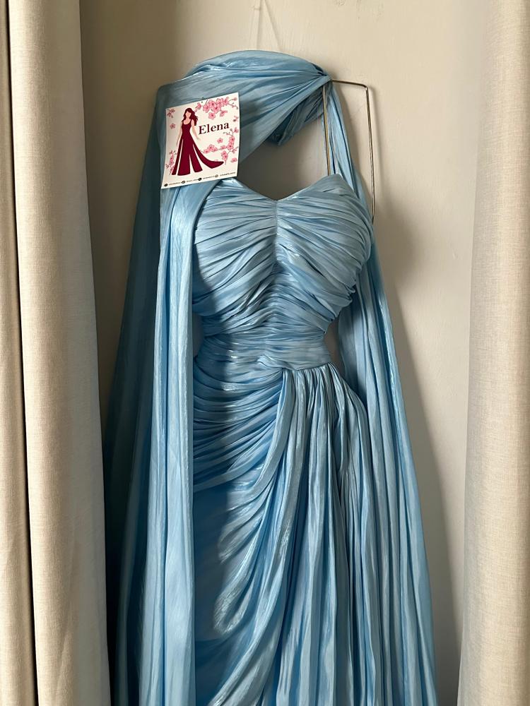 فستان سيلين الأزرق الساحر يجسد الفخامة الملكية بأبهى صورها، حيث صُمم بقصة درابيه متقنة تعكس انسيابية القماش ولمعانه الراقي. الكورساج الملتف يبرز جمال القوام، فيما تمنح الطيات الناعمة الممتدة طول الفستان حركة شاعرية آسرة. الإضافة المميزة تكمن في الوشاح الطويل المنسدل من الكتف ليمنح لمسة ملكية تضيف هيبة وأناقة لا مثيل لها. إنه الخيار الأمثل للظهور بإطلالة فريدة في المناسبات المترفة وحفلات السهرة.