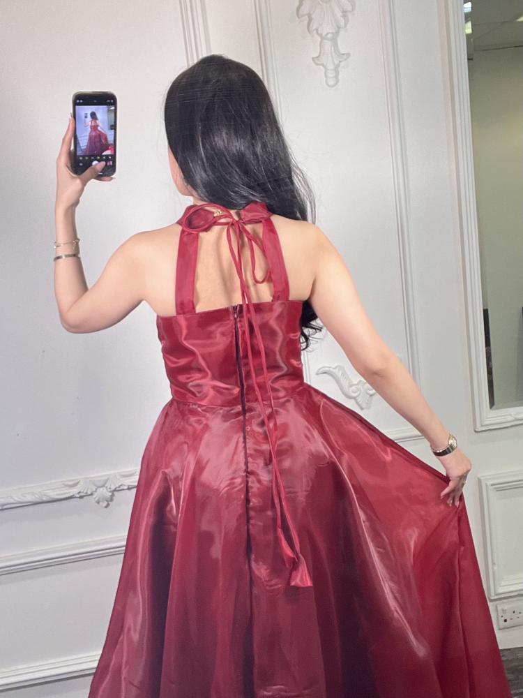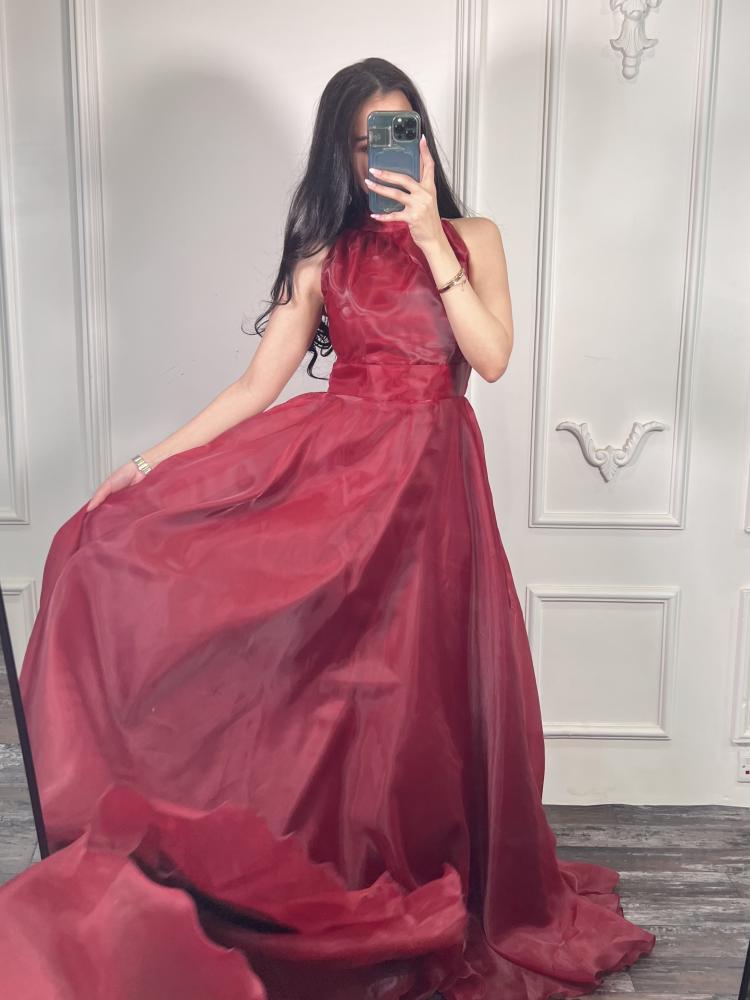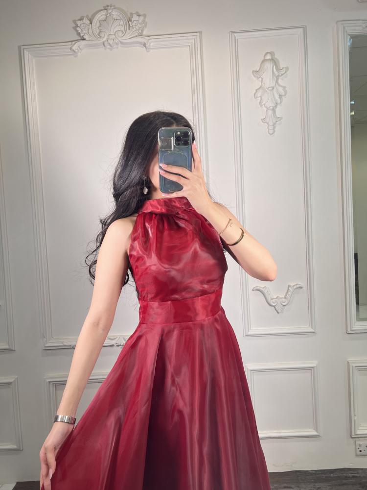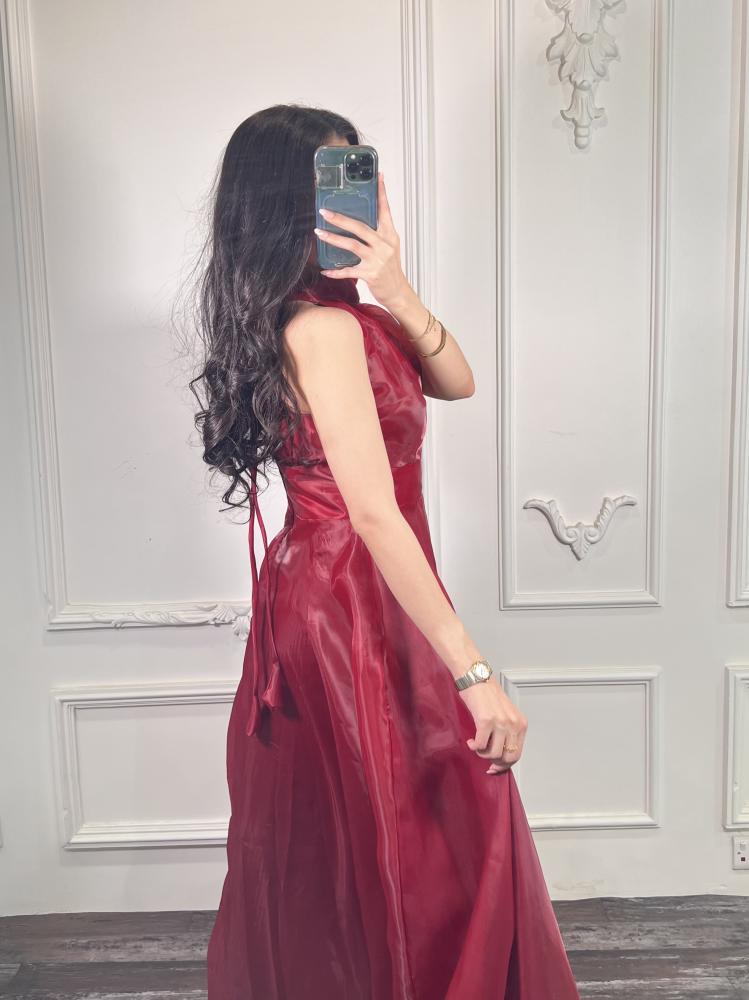 - استمتعي بإطلالة خالدة تأسر الأنظار مع هذا الفستان النبيذي الراقي بتصميم كلاسيكي أنيق بلمسة عصرية جذابة. يتميز بقصة بدون أكمام مع ياقة عالية ملتفة تُبرز جمال الرقبة وتضفي مظهراً ملكيًا متوازنًا بين القوة والنعومة. تنسدل قصة السفلية قصة واسعة بانسيابية مبهرة حتى الأرض، مما يمنحك حضورًا ساحرًا في كل خطوة.