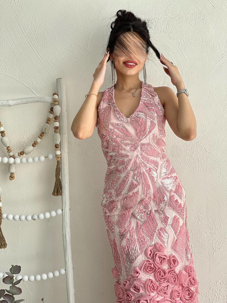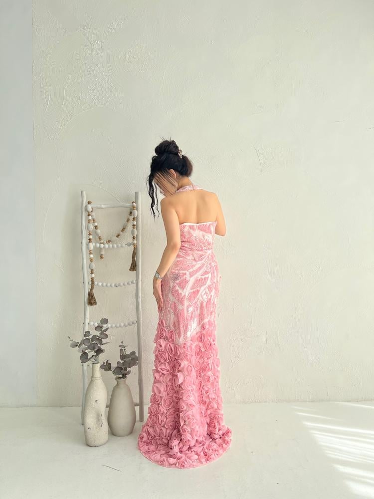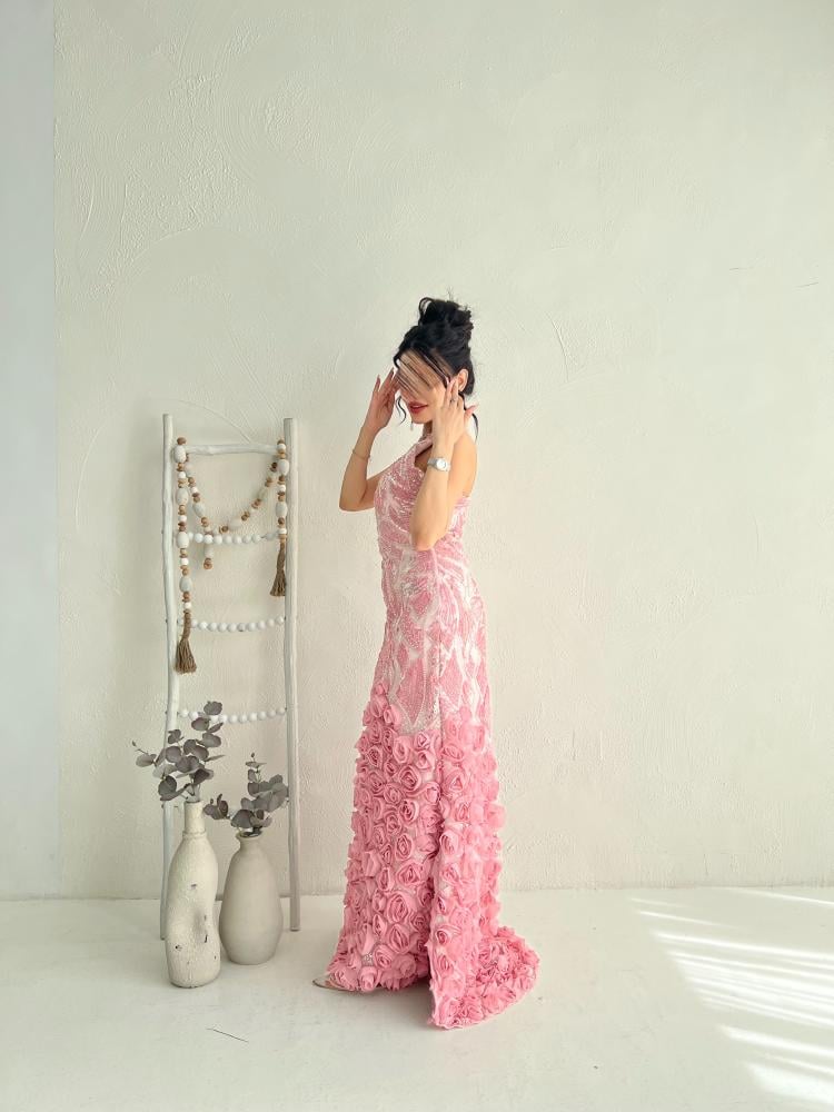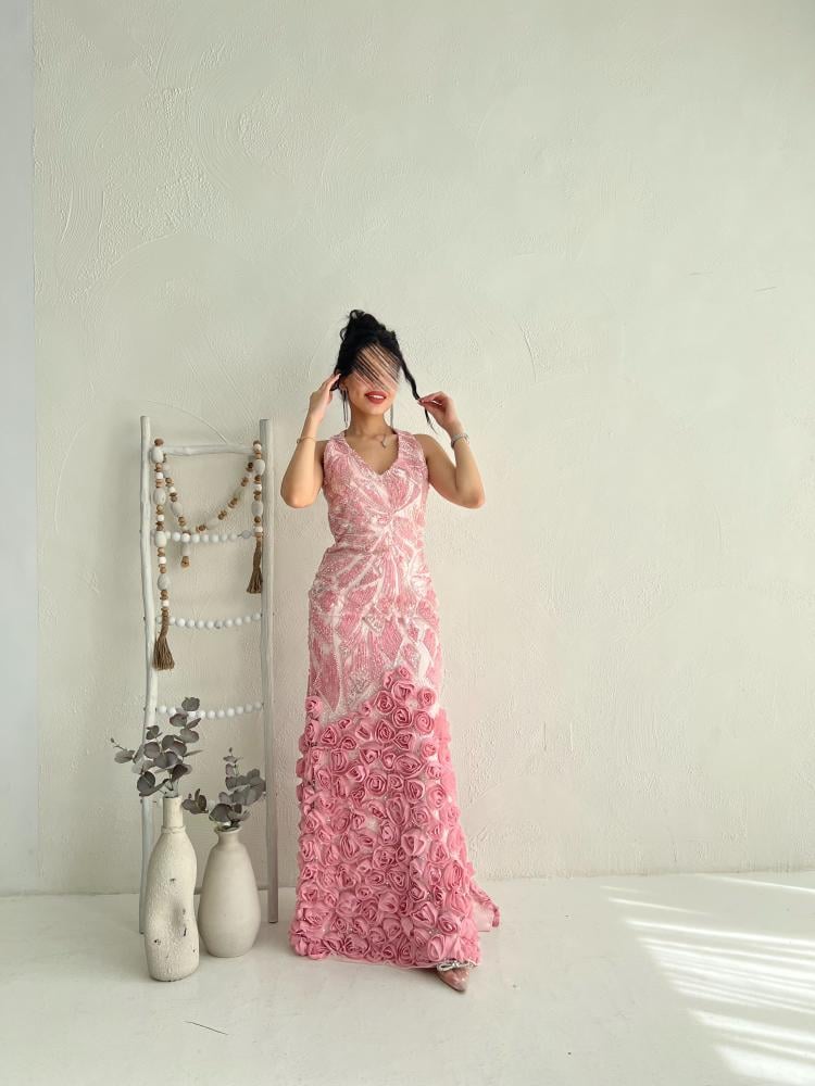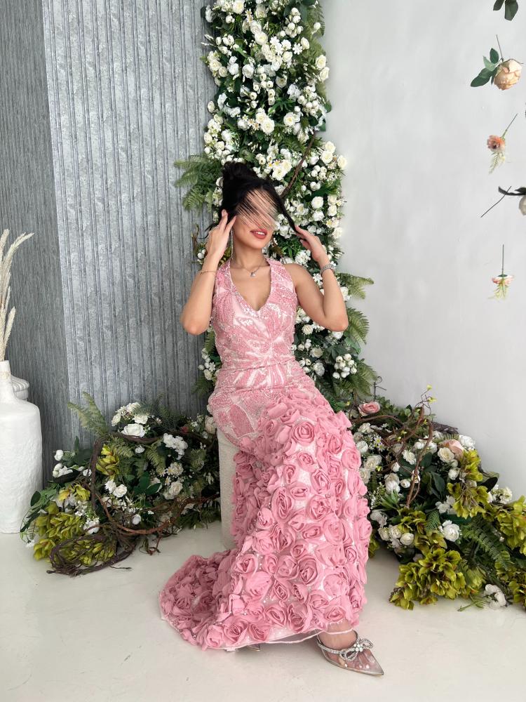 فستان روز كوتور هو قطعة فنية أنثوية راقية، صُمّم ليجسد الفخامة والرقي في كل تفاصيله. يتميز بتطريز فاخر بالخرز والكريستال الفضي على قاعدة وردية ناعمة، ليشكل لوحة متكاملة من الأناقة الراقية. الأكمام بلا أكمام تمنح إطلالة أنثوية رشيقة، فيما يضيف تصميم الورود الثلاثية الأبعاد في الجزء السفلي لمسة رومانسية حالمة تجعل الفستان فريدًا كقطعة من معرض الأزياء الراقية. قصة الفستان تنسدل بشكل مستقيم ومحدد على الجسم لتبرز جمال القوام برقة، مع فتحة عنق أنيقة على شكل V تمنح التوازن بين الجرأة والنعومة.