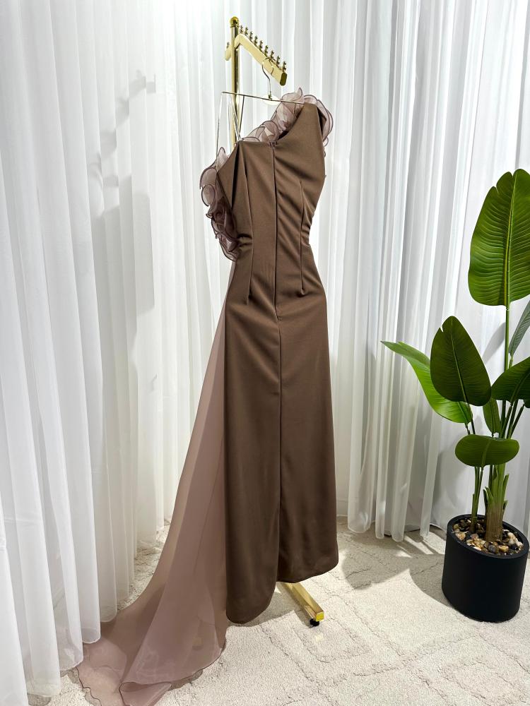 فستان كهرمان يمنحك إطلالة ناعمة وأنثوية بفضل تصميمه الانسيابي ولونه العسلي المميز. مناسب لحفلات النهار والسهرات الهادئة.
