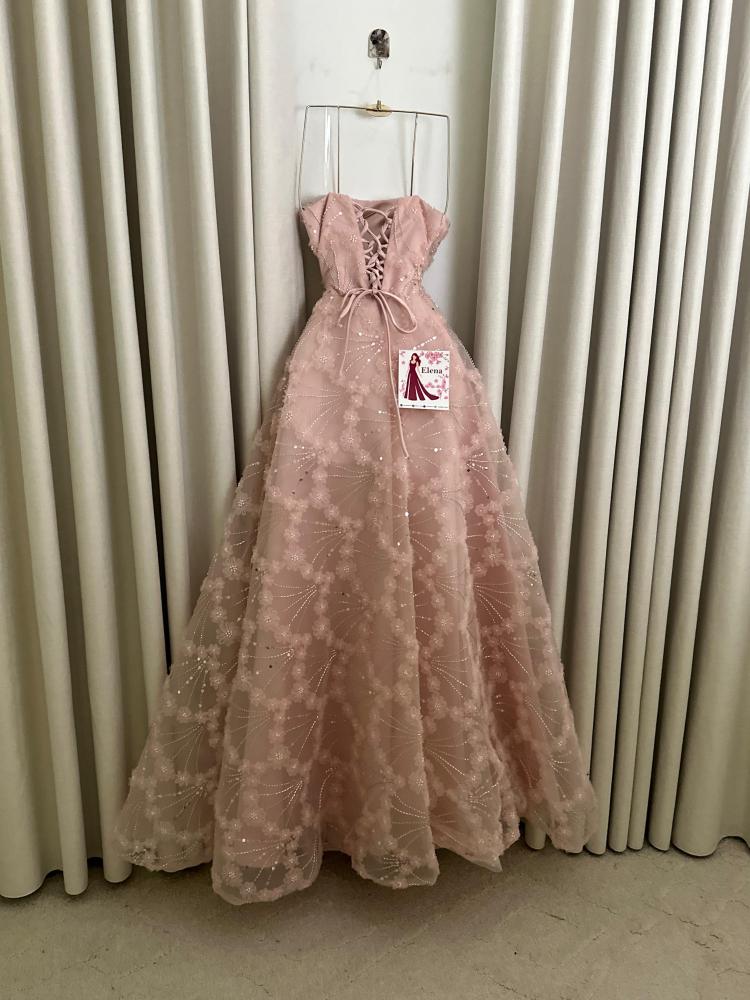 قصّة الفستان علوية على شكل كورسيه بدون أكمام، تعانق القوام وتبرز جماله بأنوثة مميزة. بينما تأتي القصة الواسعة المنسدلة بتصميم أي-لاين (A-line) طويل حتى الأرض، لتمنح حضوراً ملكياً متألقاً مع لمسة انسيابية تجعل كل خطوة أكثر سحراً. هذا الفستان هو الخيار الأمثل لحفلات الزفاف، السهرات الفاخرة، والاحتفالات الخاصة التي تتطلب إطلالة راقية لا تُنسى.