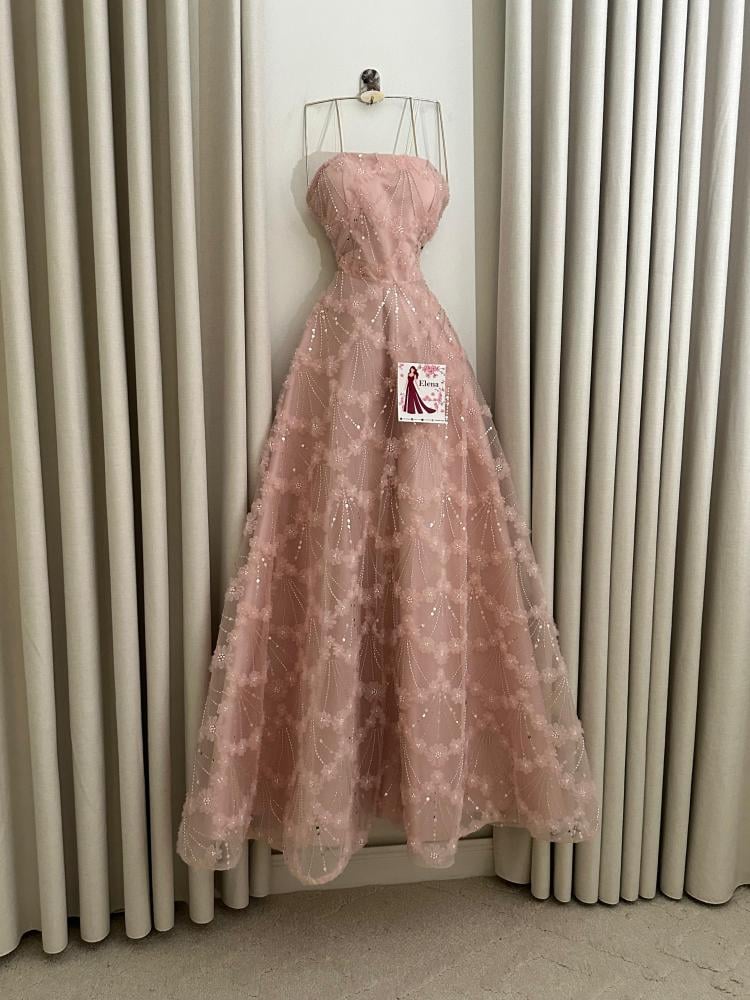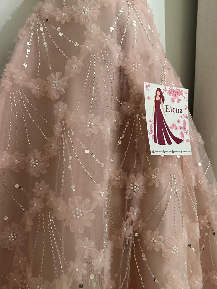 فستان روز ماسي يعكس قمة الرقي والأنوثة بفضل تصميمه الساحر الذي يجمع بين البساطة والفخامة. صُمم باللون الوردي الناعم المائل للباستيل، وهو لون يرمز للرقة والجاذبية، مما يجعله مثالياً للمناسبات الراقية. يزدان الفستان بتطريزات دقيقة من الخرز اللامع والكريستالات المتناثرة بتصميم هندسي ماسي يشبه الشبكة المرصعة، ليعكس الضوء بشكل يخطف الأبصار.