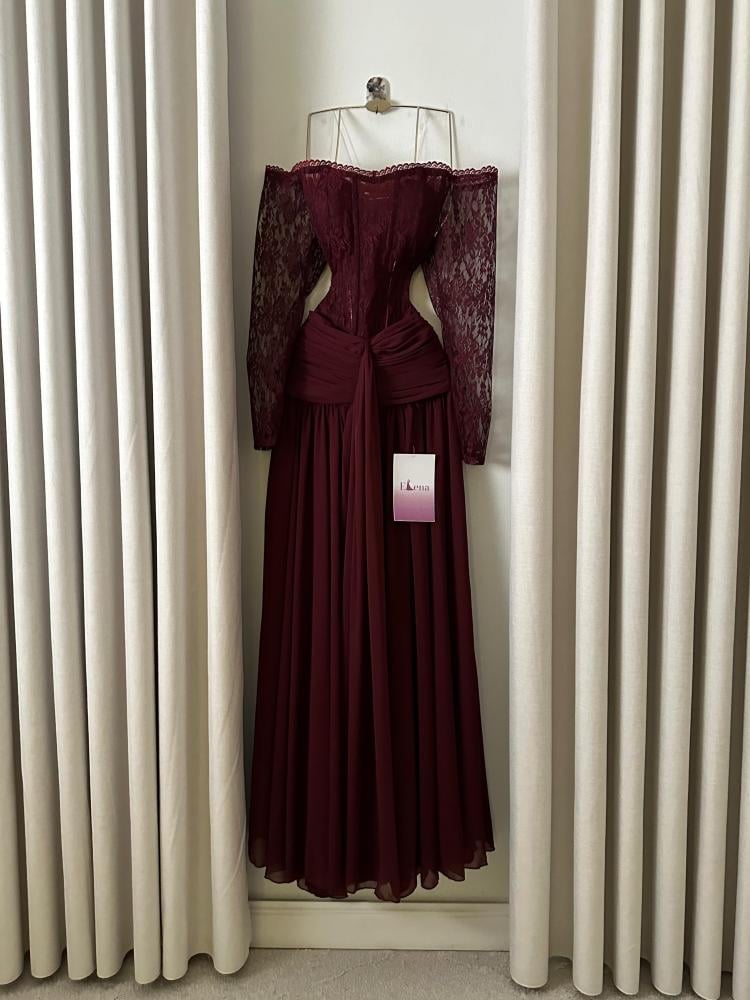 فستان عنابي دانتيل ملكي يجمع بين الفخامة والرقي في تصميم واحد، ليمنحك إطلالة ساحرة تفيض أنوثة وجاذبية. يتميز بصدريته الضيقة المصنوعة من الدانتيل الراقي مع أكمام طويلة شفافة تضفي لمسة أنثوية أنيقة، بينما يبرز خط الرقبة المكشوف الأكتاف جمال الكتفين ويمنحك حضوراً مترفاً يلفت الأنظار.