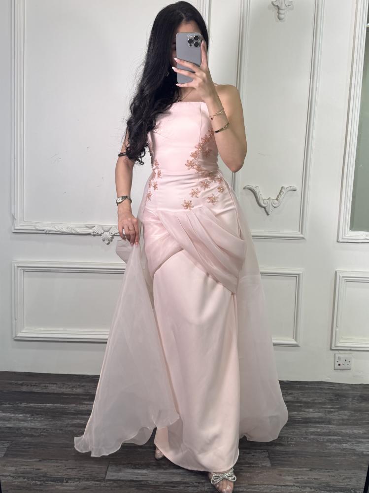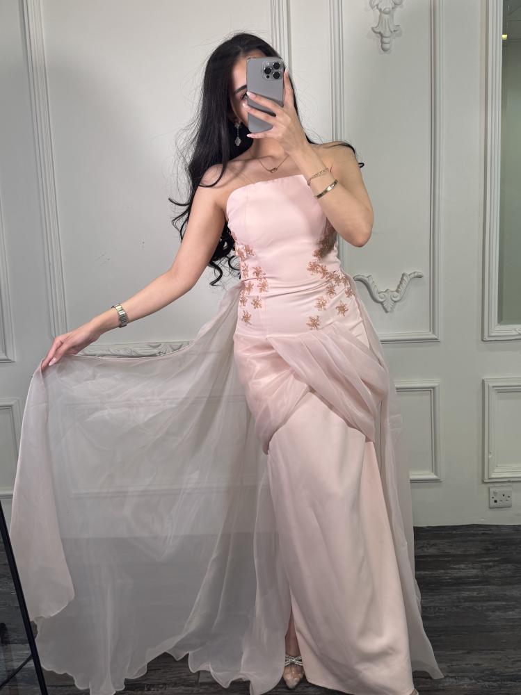 يتميز الفستان بتطريز يدوي ناعم على الخصر والجانبين على شكل زهور متلألئة، تضيف لمسة شاعرية وأنيقة. الطبقة الشفافة من التول الملتفة بانسيابية حول الخصر تمنح الفستان طابعًا ملكيًا جذابًا يجمع بين البساطة والفخامة.