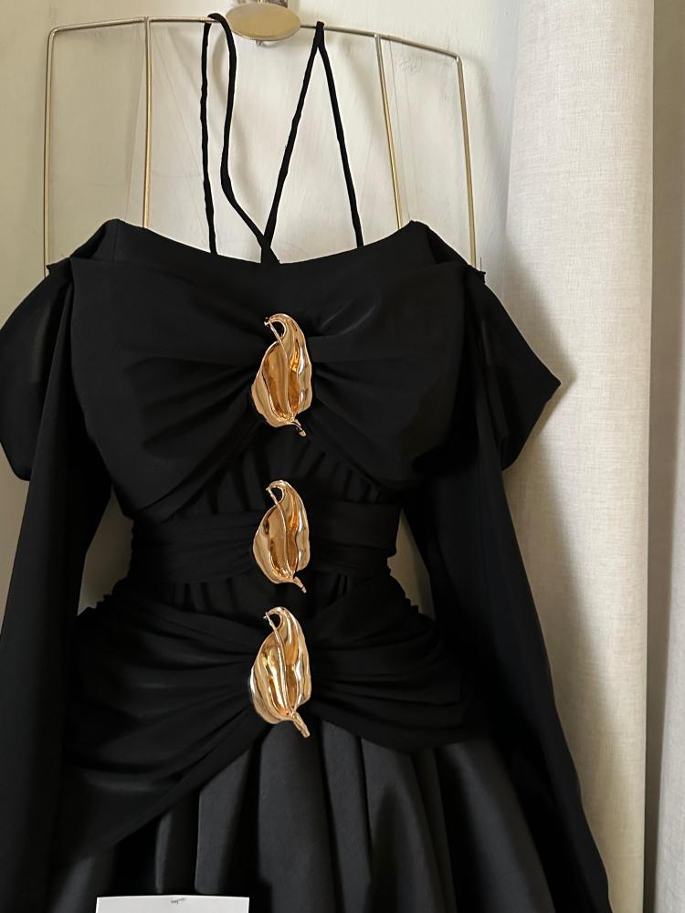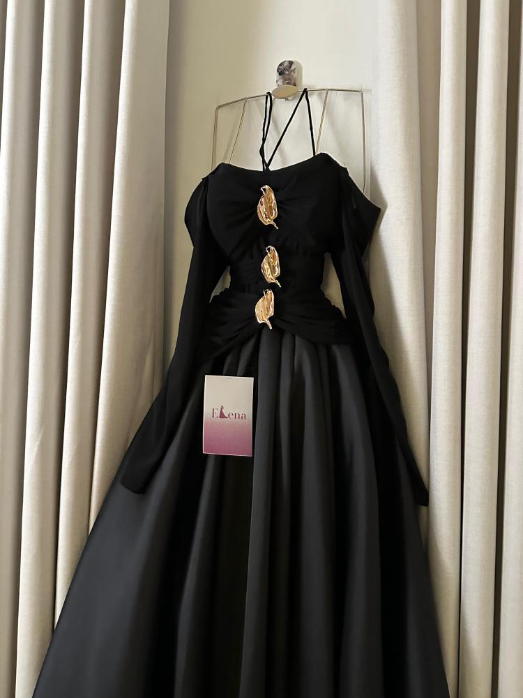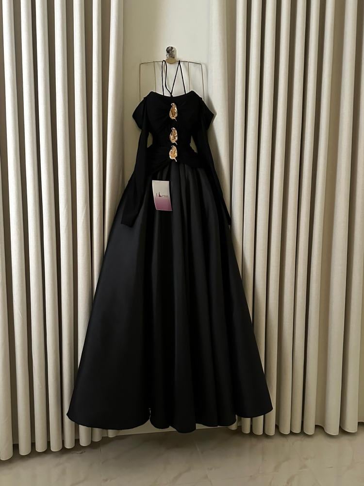فستان Black Gold الأسود الملكي هو تحفة فنية تجمع بين الفخامة والجرأة. يتميز بتصميم أوف شولدر أنيق مع حمالات متقاطعة تضيف لمسة عصرية لافتة، بينما تتوسطه تفاصيل ذهبية معدنية فاخرة على طول الصدر والخصر لتعكس بريقاً مترفاً يخطف الأنظار. تنورته المنسدلة الواسعة تمنح إطلالة ملكية راقية، لتكوني محور الاهتمام في أي مناسبة. إنه الفستان المثالي للسهرات الخاصة والمناسبات الفاخرة التي تتطلب حضوراً أنثوياً مهيباً.