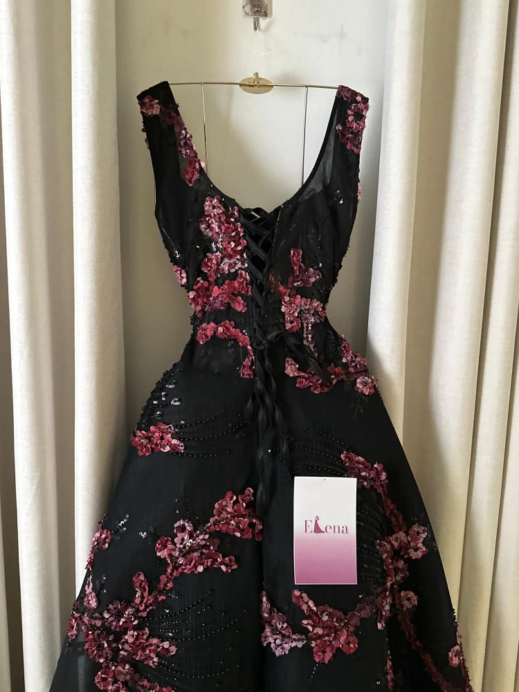 - القماش الأساسي: تول أسود فاخر مطرز بخيوط لامعة وزهور ثلاثية الأبعاد.