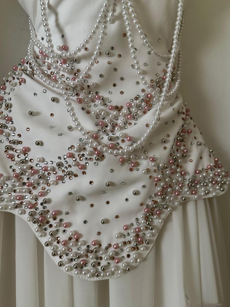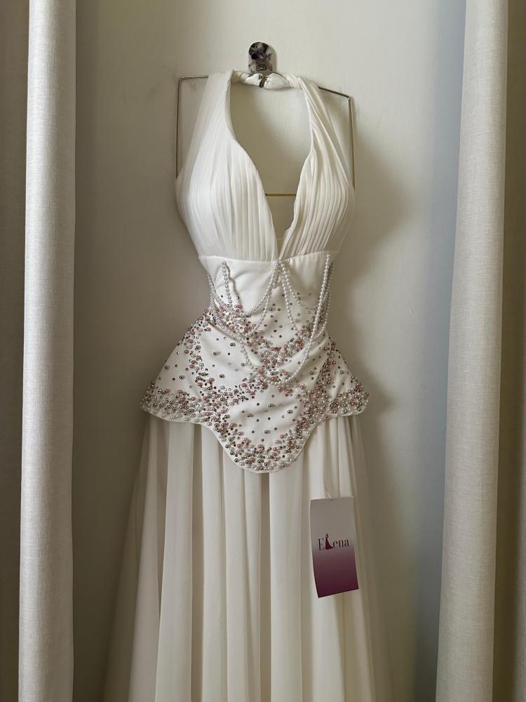 فستان بيرلا هو تجسيد للرقي والأنوثة الخالدة، حيث يجمع بين بساطة الأبيض النقي وفخامة التفاصيل المطرزة بالكريستال واللآلئ. تصميم الرقبة الهالتر مع الصدر المكشكش يمنح إطلالة أنثوية راقية، بينما تزين الخصر لمسات لؤلؤية فاخرة تتدلى بسلاسة لتضفي وهجاً ملكياً لا يُقاوم. الفستان يمتد بانسيابية ساحرة نحو الأرض، ليمنحك حضوراً مهيباً في حفلات الزفاف، السهرات الفاخرة، وحفلات الخطوبة. إنه قطعة فنية تعكس البذخ والرقة في آن واحد.