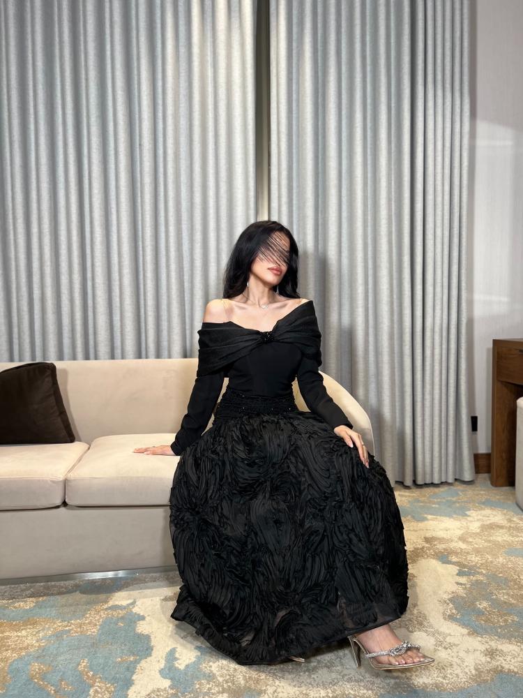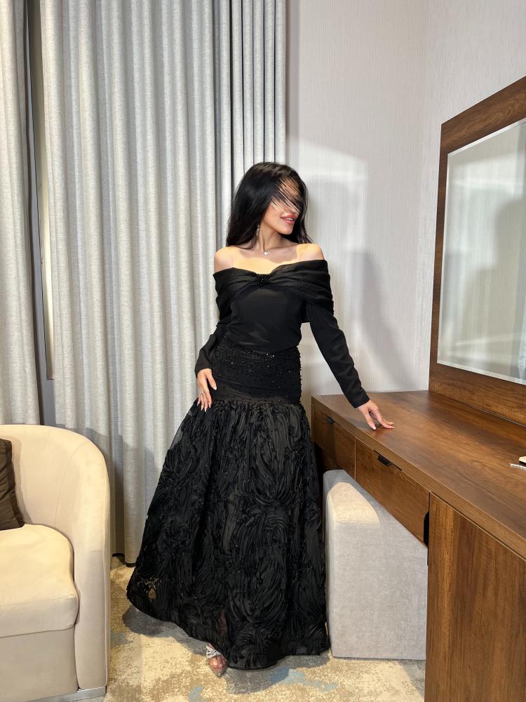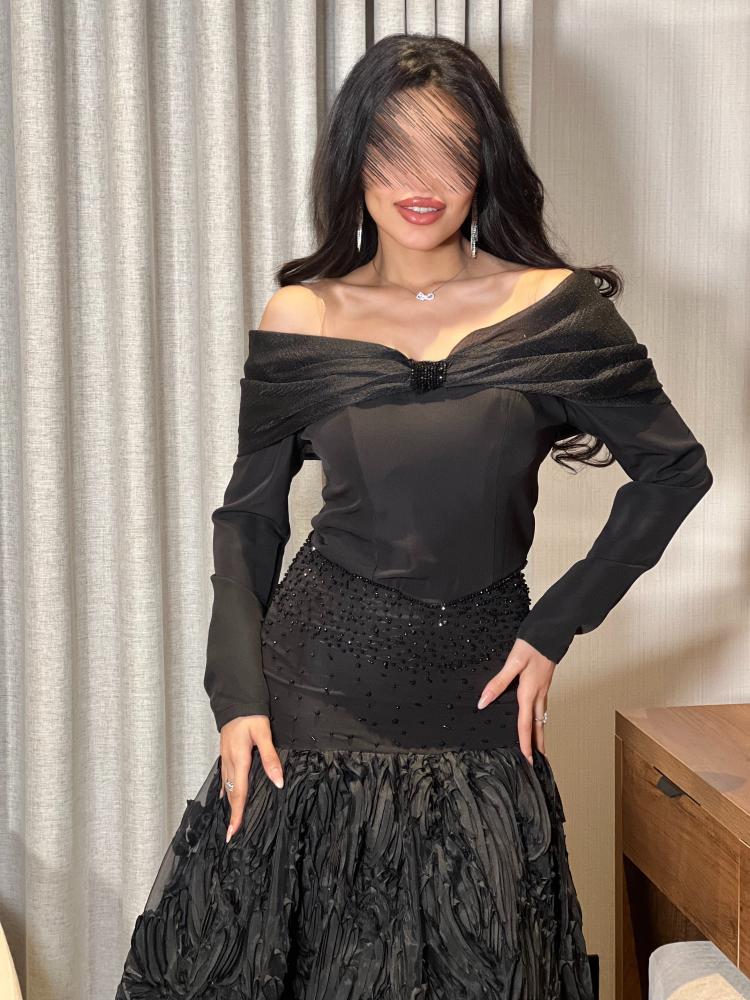 يأتي الخصر ضيقاً ومزخرفاً بتطريز فاخر من الخرز الأسود اللامع، يبرز رشاقة القوام وينتقل بتناغم إلى تنورة مصنوعة من قماش مطوي ومجعّد يدوياً، يمنحها حجماً مميزاً وحضوراً ساحراً. هذه القطعة مثالية للمناسبات الرسمية والسهرات المسائية الفخمة حيث تتركين أثراً لا يُنسى.
