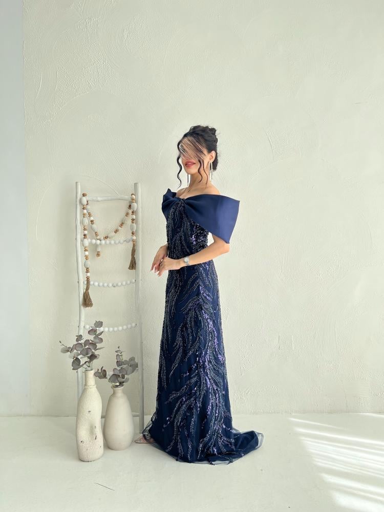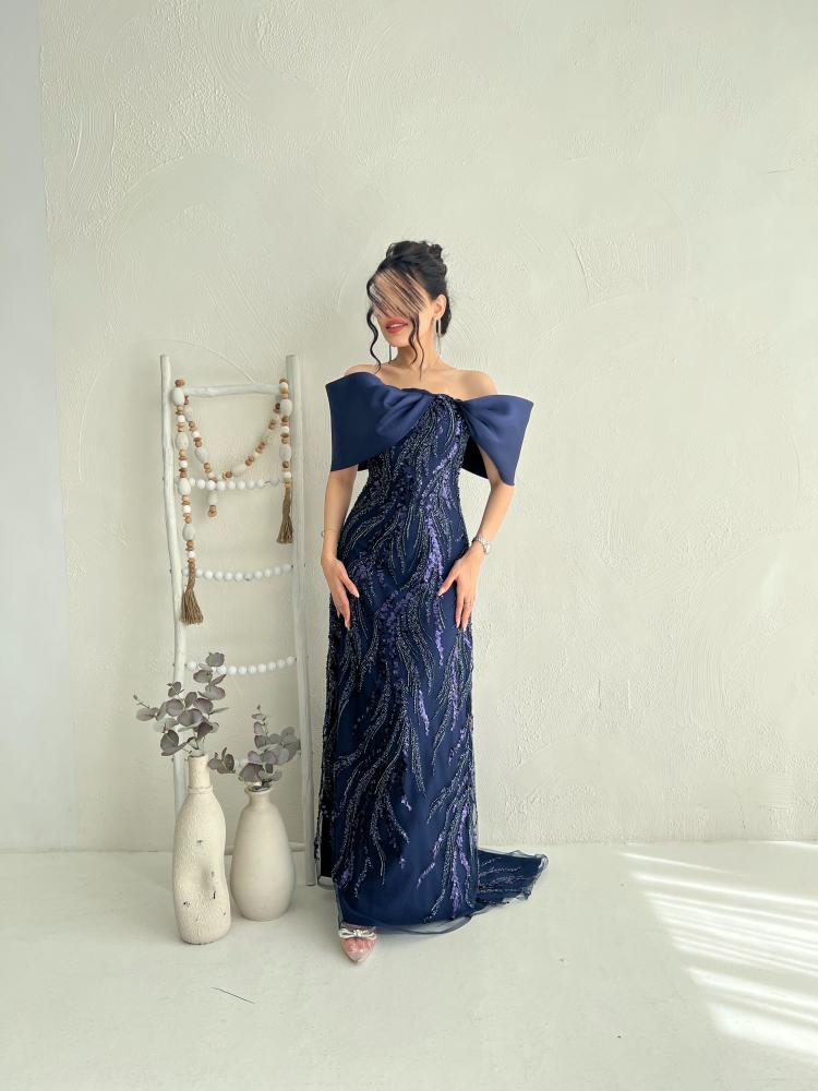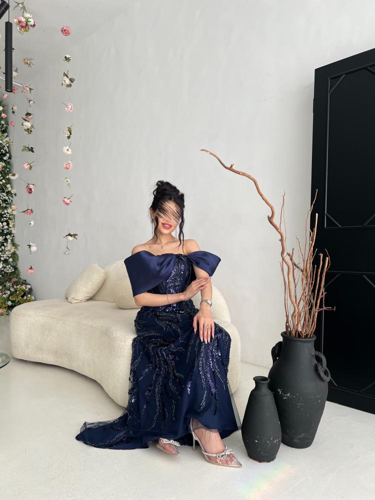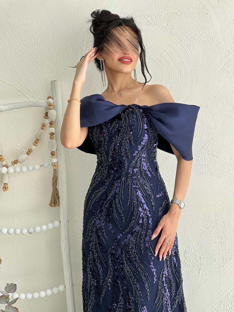 فستان إيفنينغ رويال هو رمز الفخامة والأناقة الملكية، بتصميم ساحر يجمع بين الرقي والجرأة. يتميز بلون كحلي عميق (Navy Blue) مرصّع بتطريز فاخر من الترتر والكريستالات اللامعة بتدرجات بنفسجية، مما يمنحه لمسة من السحر الليلي البراق. الصدر مزدان بربطة كبيرة من الساتان الفاخر على شكل أوف شولدر تضيف بعدًا دراميًا أنثويًا، ليبدو الفستان كقطعة فنية تُخاطب ذوق المرأة التي تبحث عن التميز في كل مناسبة. قصة الفستان الانسيابية تمنح القوام إطلالة ممشوقة ومتناغمة، ليكون الخيار المثالي للسهرات الفاخرة وحفلات الزفاف.